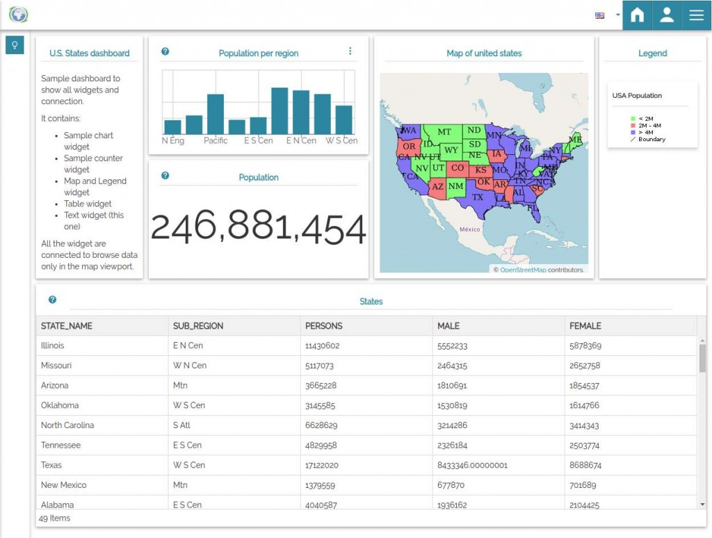 - Dashboards: you can now create your own dashboard to mix maps with charts and other widgets to create advanced visualizations that you can save and share as you already do with maps