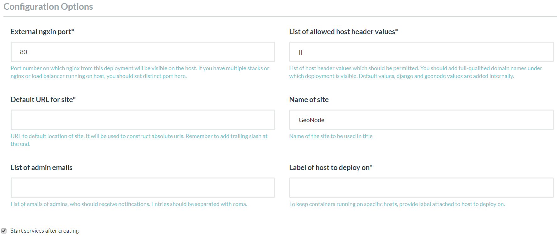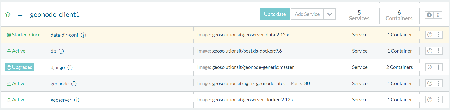 The result was the “GeoNode Generic” project template for Docker Compose template v.2 and Rancher 1.6 It can be loaded directly from Rancher UI defining a custom catalog pointing to the GitHub project’s repository.
