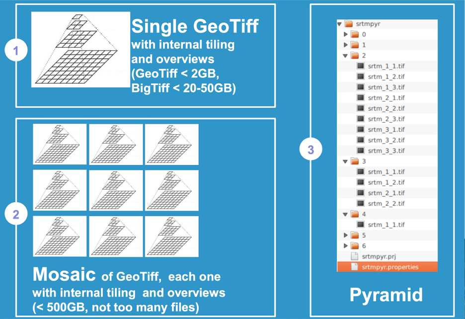How do you structure a GeoTIFF? There are several structures such as structuring the data in a Single GeoTiff, in a Mosaic or in a Pyramid.